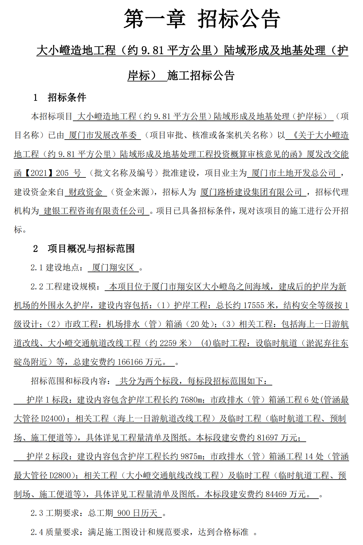 16億大項目!廈門大小嶝造地工程! 發布日期:2021年06月04日 瀏覽次數:3439 關鍵字: 公司 項目基本信息招標項目編號: E3500000717002736002招標人: 廈門路橋建設集團有限公司招標代理名稱: 建銀工程咨詢有限責任公司招標類型: 施工招標方式: 公開招標聯系電話: 13616032431